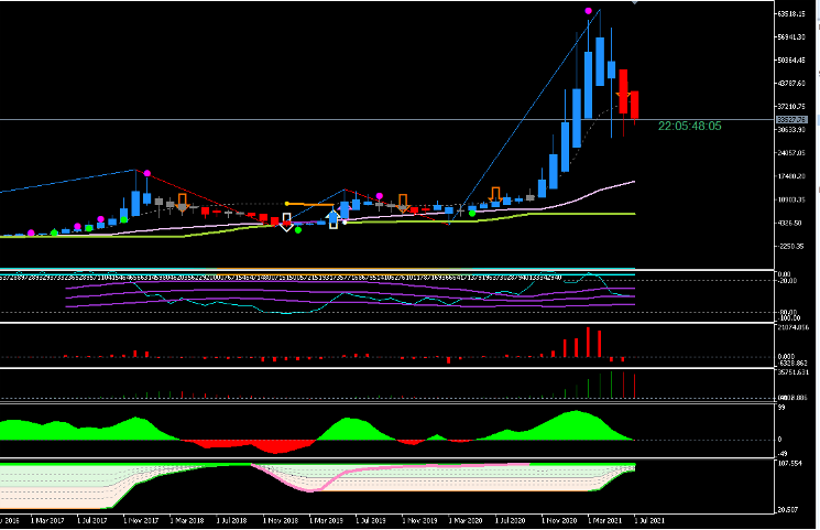 Sie sehen den monatlichen Kerzenchart 2017 - 2021. Die Software zeigt am Anfang des Monats einen Punkt. Dieser zeigt die nächste wahrscheinliche Richtung auf.
